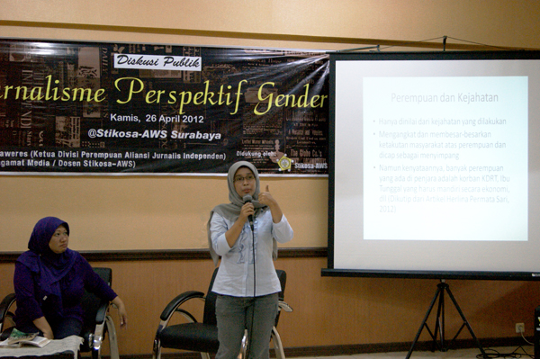 Actasurya.com-Kamis (26/5) Acta Surya menggelar diskusi publik yang bertemakan ‘Jurnalisme Perspektif Gender’ di ruang Seminar, Stikosa AWS. Diskusi yang dihadiri beberapa delegasi Lembaga Pers Mahasiswa se-Surabaya ini disampaikan oleh koordinator divisi perempuan AJI Indonesia yang juga alumni Stikosa – AWS Rachmawati Alida Bahaweres, dan pengamat media sekaligus dosen Stikosa AWS Suprihatin.