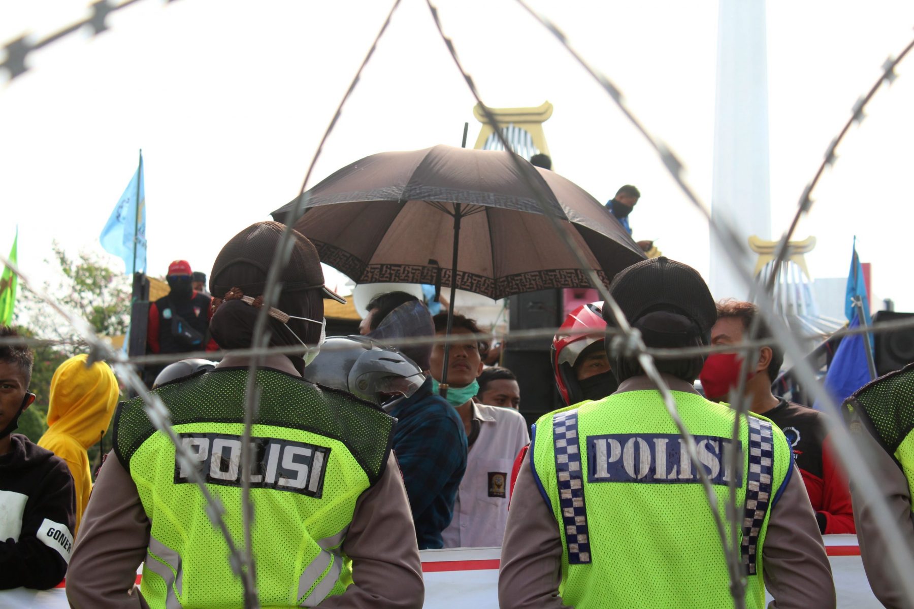 Beberapa polisi sedang berjaga di depan Kantor Gubernur, Jalan Pahlawan 110, yang sudah dilindungi oleh pagar kawat berduri. Mereka memantau massa aksi dari kalangan buruh saat berorasi (08/10).