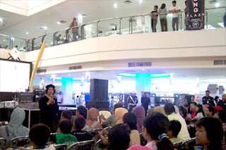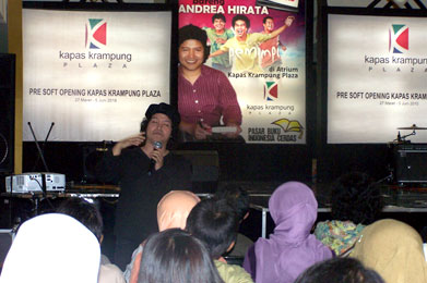 Sejak “Laskar Pelangi” difilmkan, nama Andrea Hirata bak selebritis di tanah air. Sabtu (1/5) malam, sosok pemimpi kebanggaan Belitong itu hadir di Atrium Kapas Krampung Plaza. Berdiri di tengah para penggemarnya, dengan santai Andrea mengobrol dan tertawa bersama mereka. Tanpa banyak basa-basi, Andrea langsung mengajak pengunjung berinteraksi dengannya.