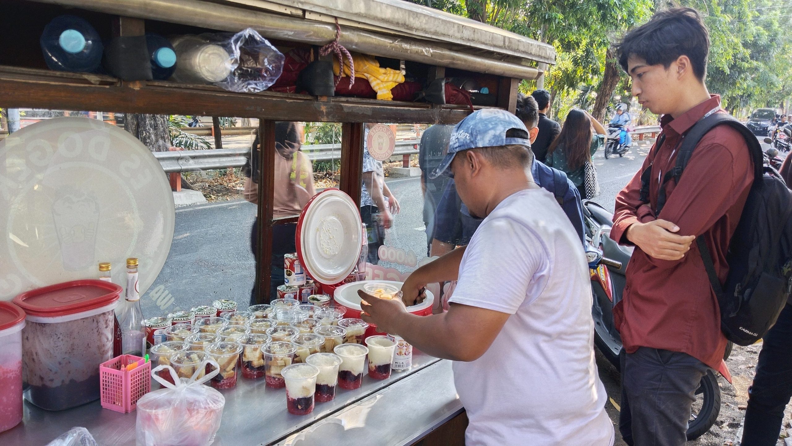Diketahui, pria 33 tahun ini sudah berdagang es doger ini sejak 2011 silam. Adapun isian es doger yang ia jual berupa sagu mutiara, ketan, roti, degan, es serut, yang disiram dengan sirup coco pandan dan kental manis. (N/F: Kik)