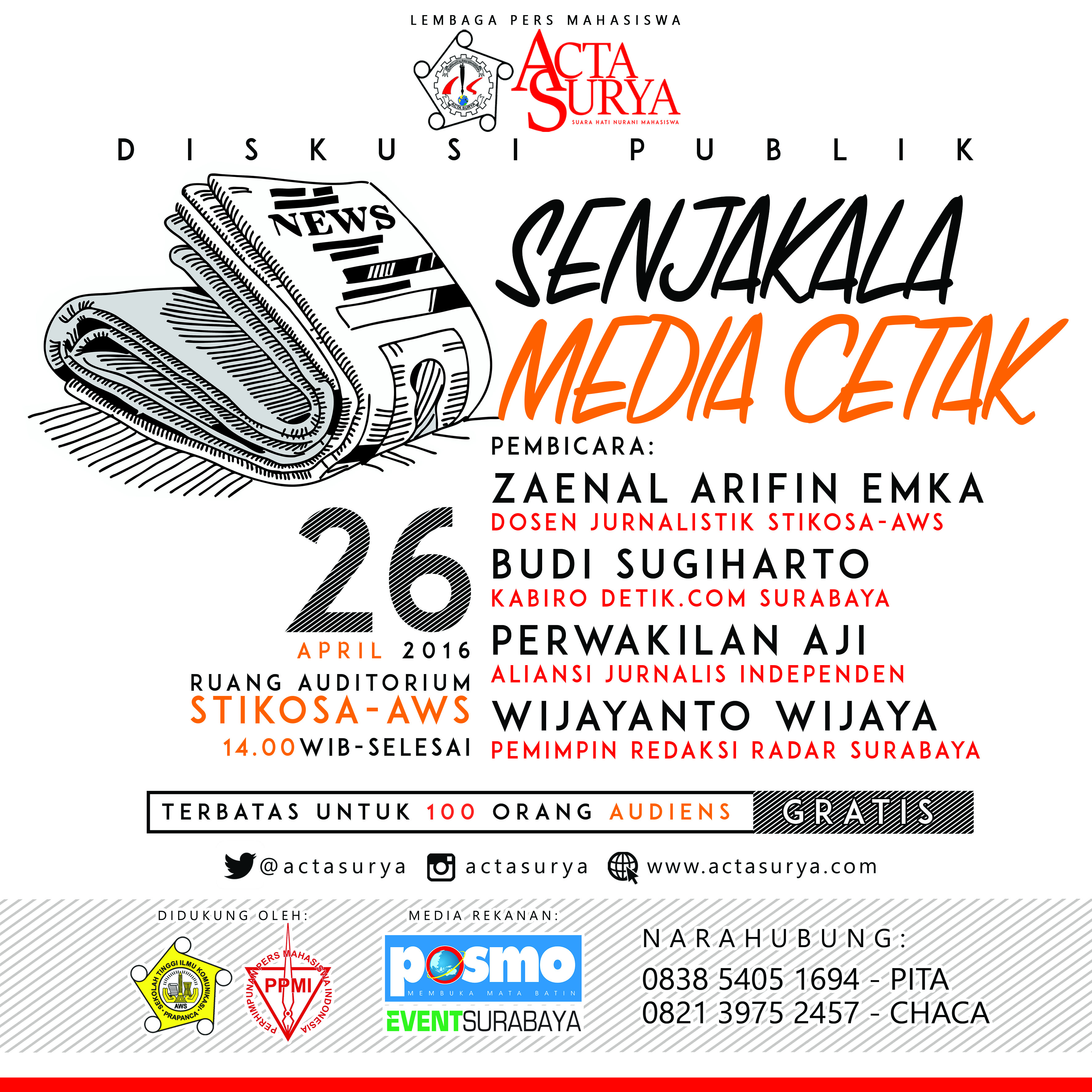 Acta Surya adalah Lembaga Pers Mahasiswa yang turut berkontribusi dalam pemberitaan dan penerbitannya masih menggunakan media konvensional; cetak. Dan dengan kekhawatiran ini, Acta Surya akan menghelat Diskusi Publik yang bertemakan ‘Senjakala Media Cetak’