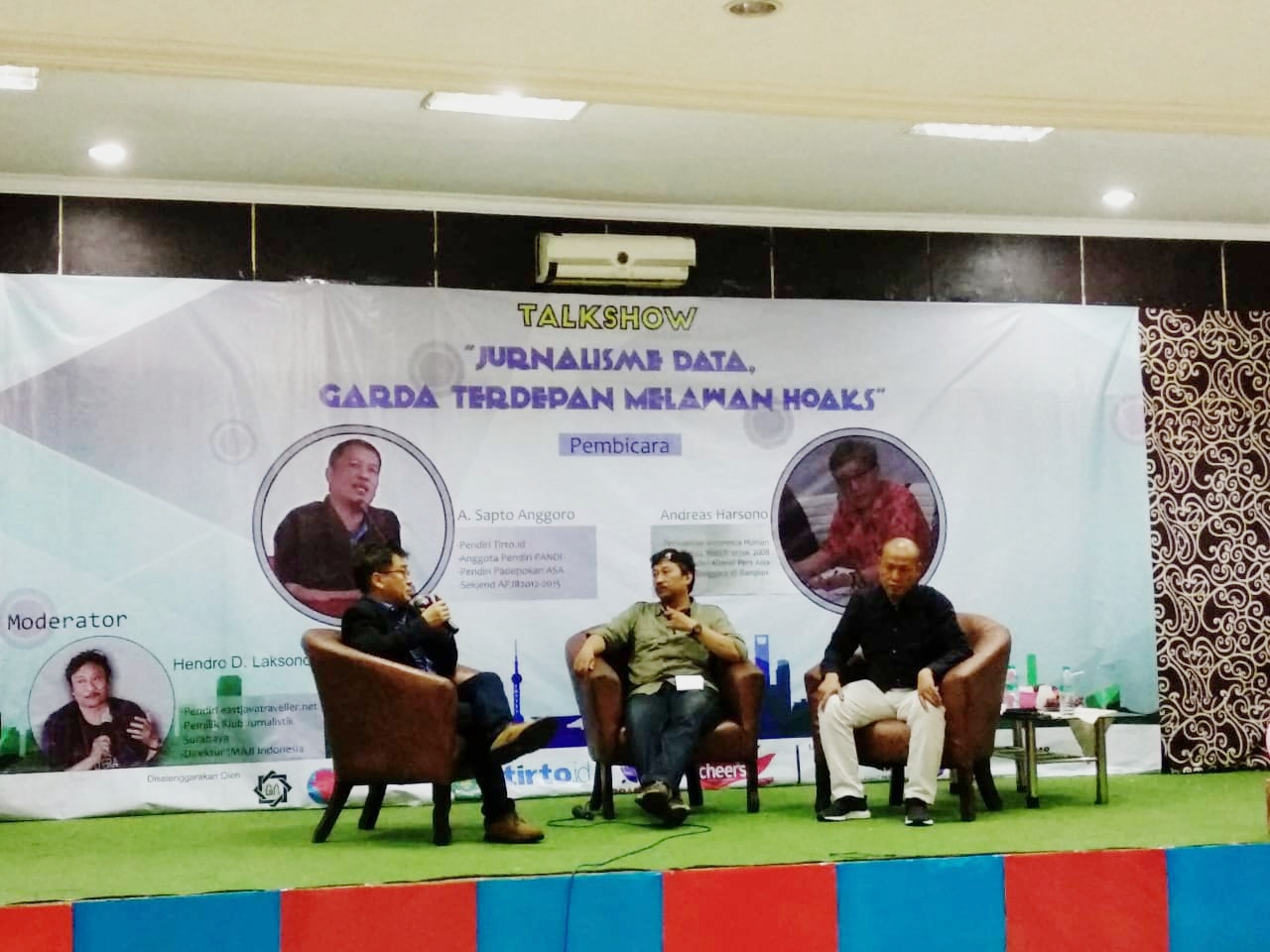 Dari kiri Andreas Harsono sebagai narasumber, Hendro D Laksono sebagai moderator dan A Sapto Anggoro sebagai narasumber di bidang Jurnalisme Data, dalam Talkshow bertajuk Jurnalisme Data, Garda Terdepan Melawan Hoaks, yang diselenggrakan LPM Solidaritas, sabtu (22/12) di SAC lantai tiga, Uinsa, Surabaya