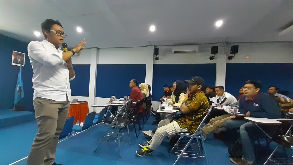 Ari Priambada, selaku pemateri memberikan wawasan Fotography maupun Vidiography dalam Workshop produksi audio visual di Ruang Multimedia, Kampus Stikosa- AWS, Rabu (19/06).