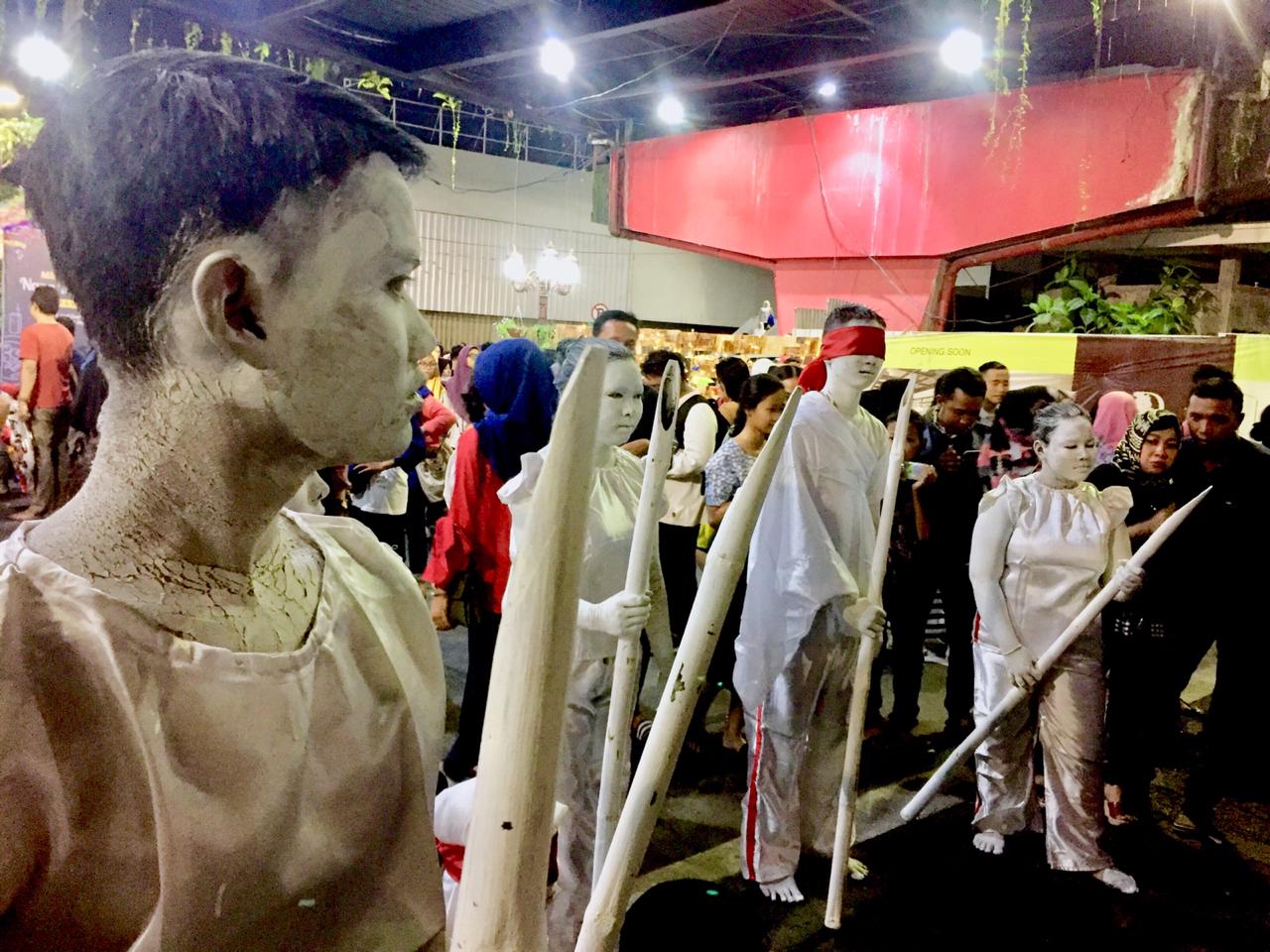Di tengah-tengah, pengunjung dikejutkan dengan sekelompok manusia yang berdiri sejajar menyerupai patung pejuang dengan dandanan warna putih di sekujur tubuh dan membawa tongkat bambu runcing. Keberadaan patung ini lantas menyita perhatian ratusan ribu pasang mata yang melewati area tersebut.