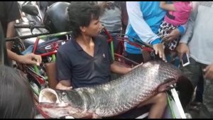 “Waktu saya mancing, sekitar jam 10an tiba-ada ikan besar keluar dari sungai. Ya saya kaget, langsung saja panggil orang-orang, ada enam orang yang bantu. Dapet ikannya itu pakai jala, setrum, tembak sama dikepung warga yang membantu, itu pun lama, tiga jam baru bisa di tangkap tapi ikannya mati,” ujar Heri.