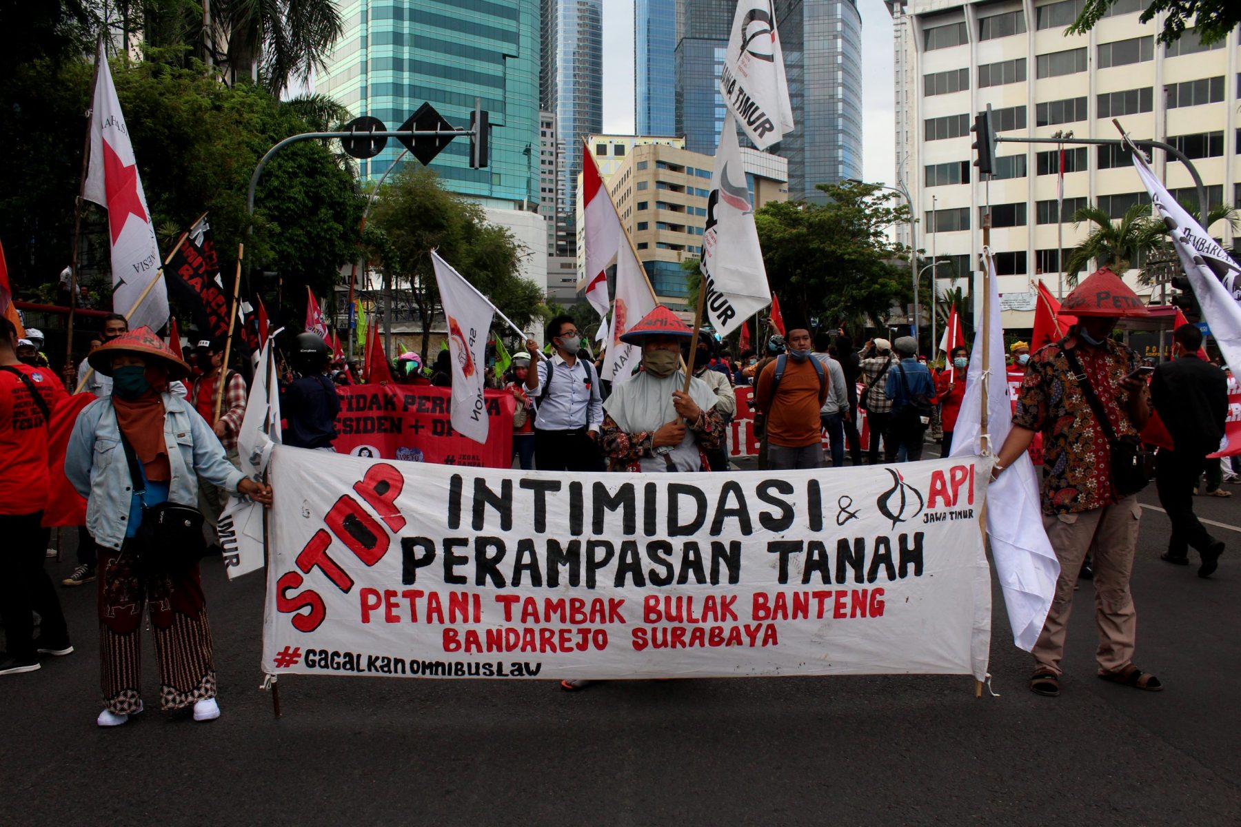 Sekitar pukul 16.00 WIB massa aksi dari elemen buruh, petani, dan mahasiswa mulai berdatangan. Mereka tergabung dalam Gerakan Tolak Omnibuslow (GETOL) untuk menyuarakan aspirasinya tepat di depan Gedung Negara Grahadi Surabaya.