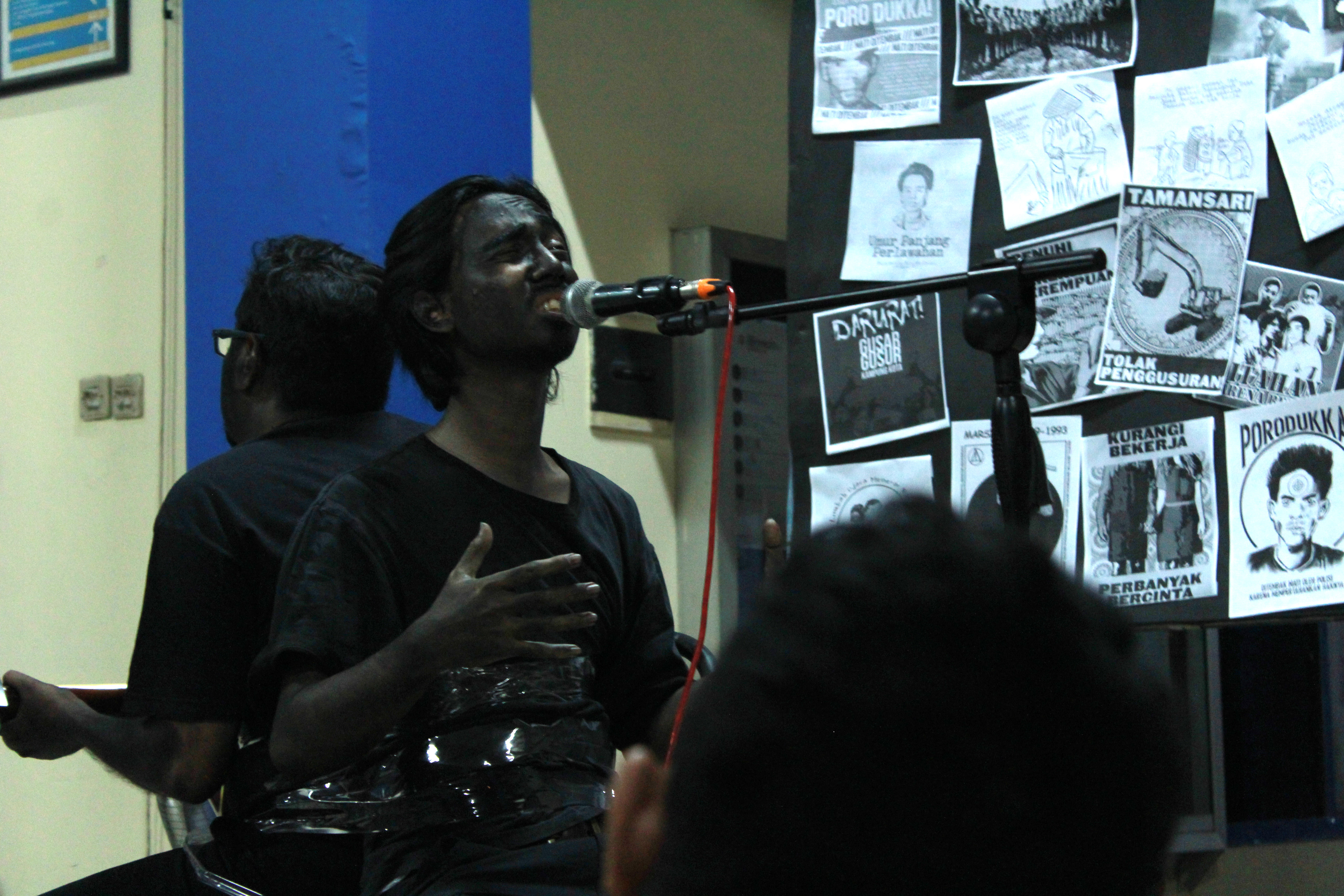 Malam itu ada puisi Seonggok Jagung karya WS. Rendra, disuguhkan sebagai pembuka acara diskusi tersebut yang dibawakan oleh Iqbal “Corong” dari Teater Lingkar, dan dilanjutkan pembacaan puisi Sebatang lisong oleh Aditya Poundra.September Hitam, Soal Pergerakan Mahasiswa. (N/F: Sasa, Jelita)