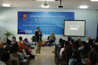 Seminar yang bertajuk ‘Peran Media dalam Pemilihan Presiden’, yang membahas studi kasus pemilihan presiden di Amerika Serikat dengan pemilihan presiden di Indonesia. Selain Andrew, seminar ini juga menghadirkan Sirikit Syah sebagai pembicara, yang tak lain penggagas acara tersebut.
